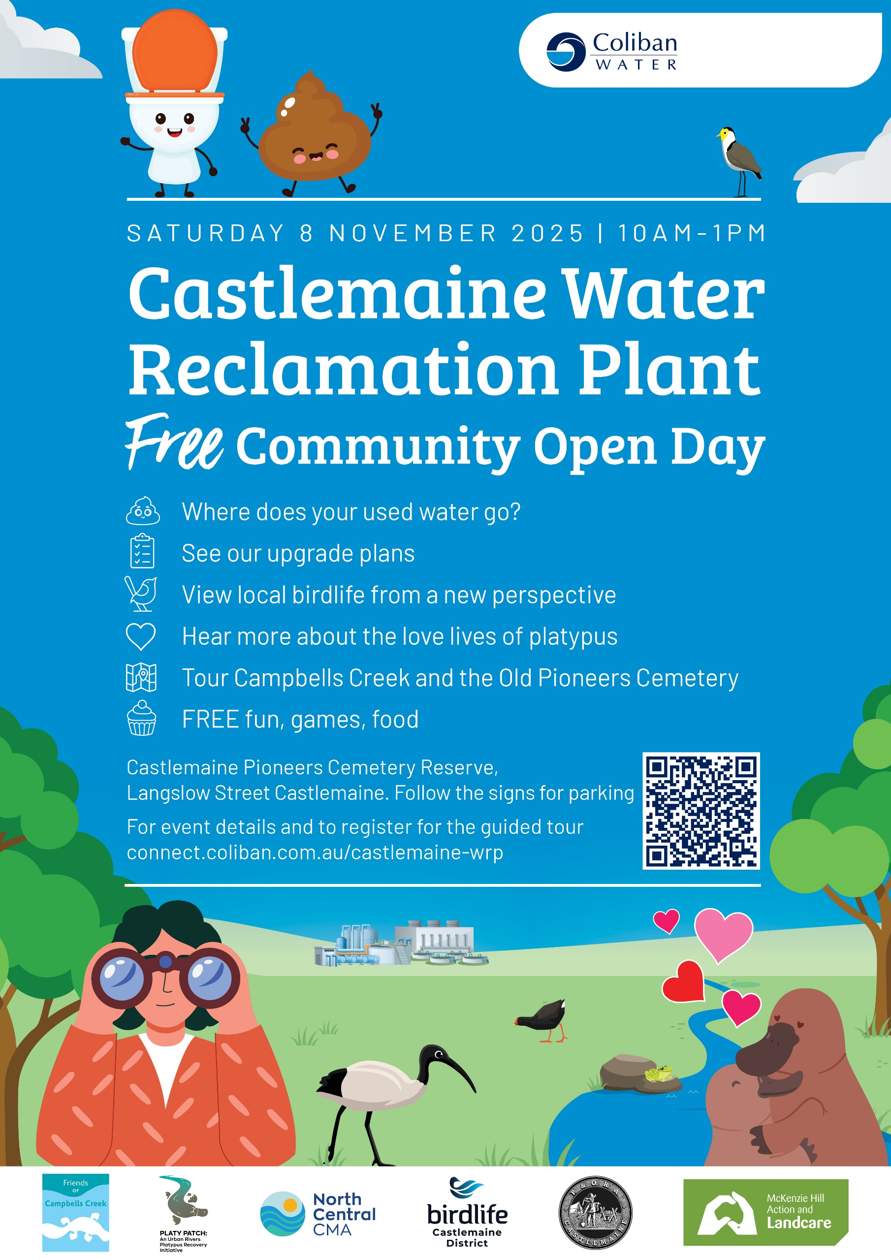 Join us and our community partners on Saturday 8 November between 10am and 1pm as we showcase what's happening in and around the Castlemaine Water Reclamation Plant.